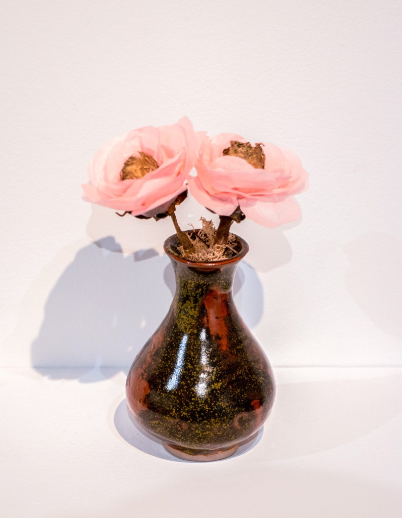 This work is in memorial of my grandparents who passed away. The cast roses were collected from Joan Maurer’s funeral and were dried in preparation with this piece.