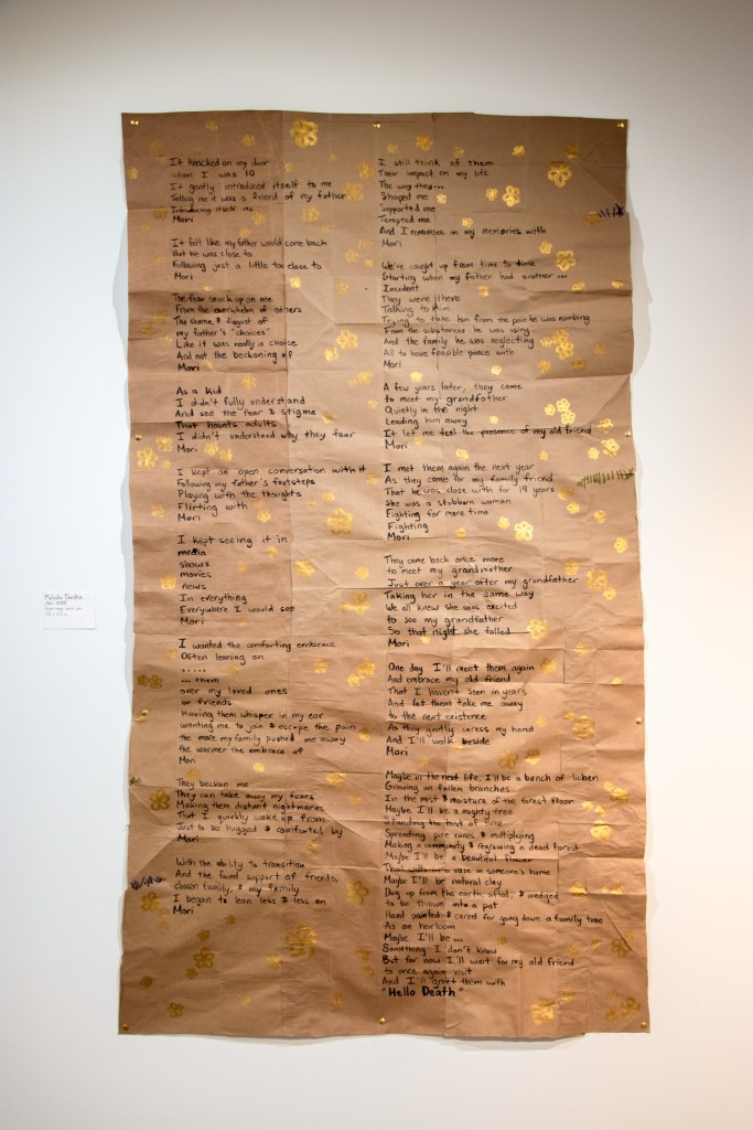 Mori, 2025, Paper bags, paint pens, embroidery thread, 36 x 65 in.